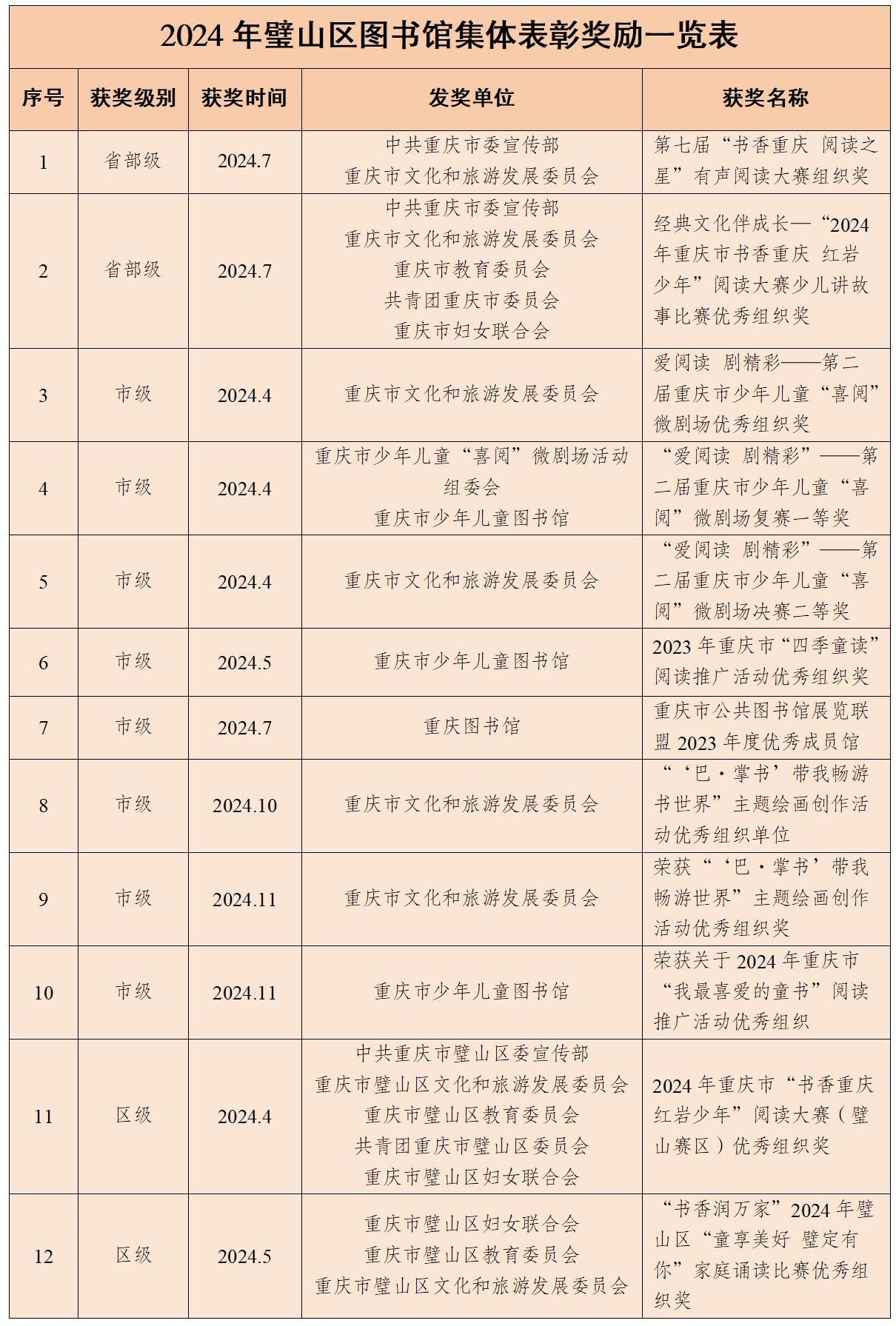 2024年,璧山区图书馆共计获得省部级奖项2次,市级奖项8次,区级奖项2次。这些奖项是对我们工作的认可,激励着我们继续努力,为社会提供更好的服务。