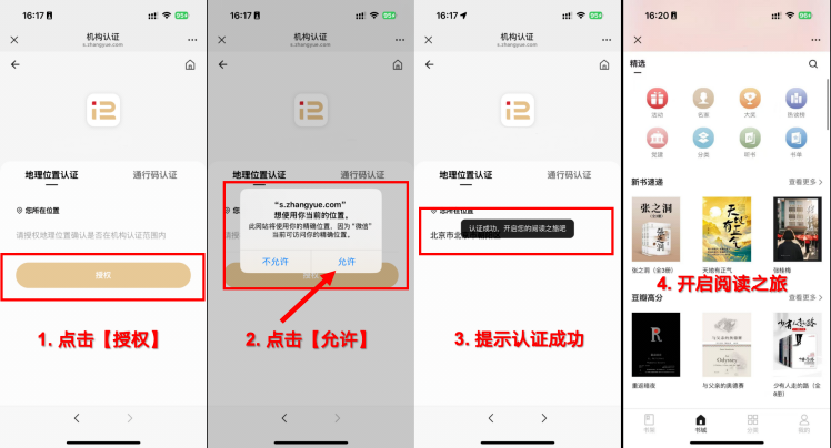 点击【授权】,点击【允许】使用你当前的位置,认证成功后即可开启免费在线阅读