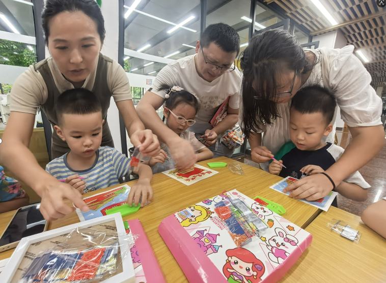 “国庆钻石贴画”活动中,孩子们以五星红旗和天安门城楼为主题,用点钻笔将一颗颗闪亮的“钻石”精心粘贴,创作出闪耀着光芒的爱国主题画作,自豪感与成就感油然而生。