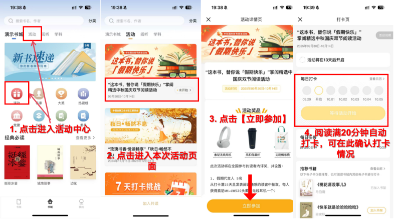 点击顶部【活动】,进入活动页面后点击【立即参加】即可参与阅读打卡活动